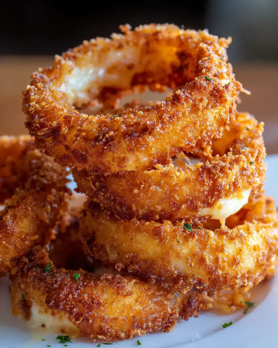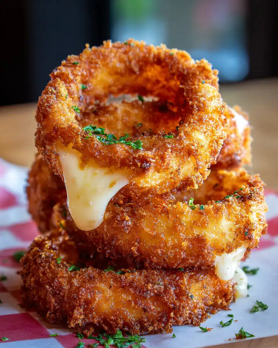 Feeling inspired? Dive into the full recipe below to make your own Crispy Cheesy Mozzarella Onion Rings, perfect for any occasion!