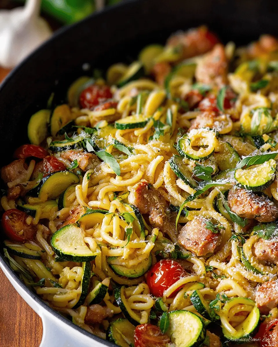 The Chicken Zucchini Pasta Skillet is a delightful fusion of flavors, making it an ideal go-to for busy weeknights. With tender chicken sausages, fresh veggies, and nourishing pasta, it’s nutritious and satisfying. Try this recipe, and you’ll have a delicious meal in just 20 minutes! Enjoy!
