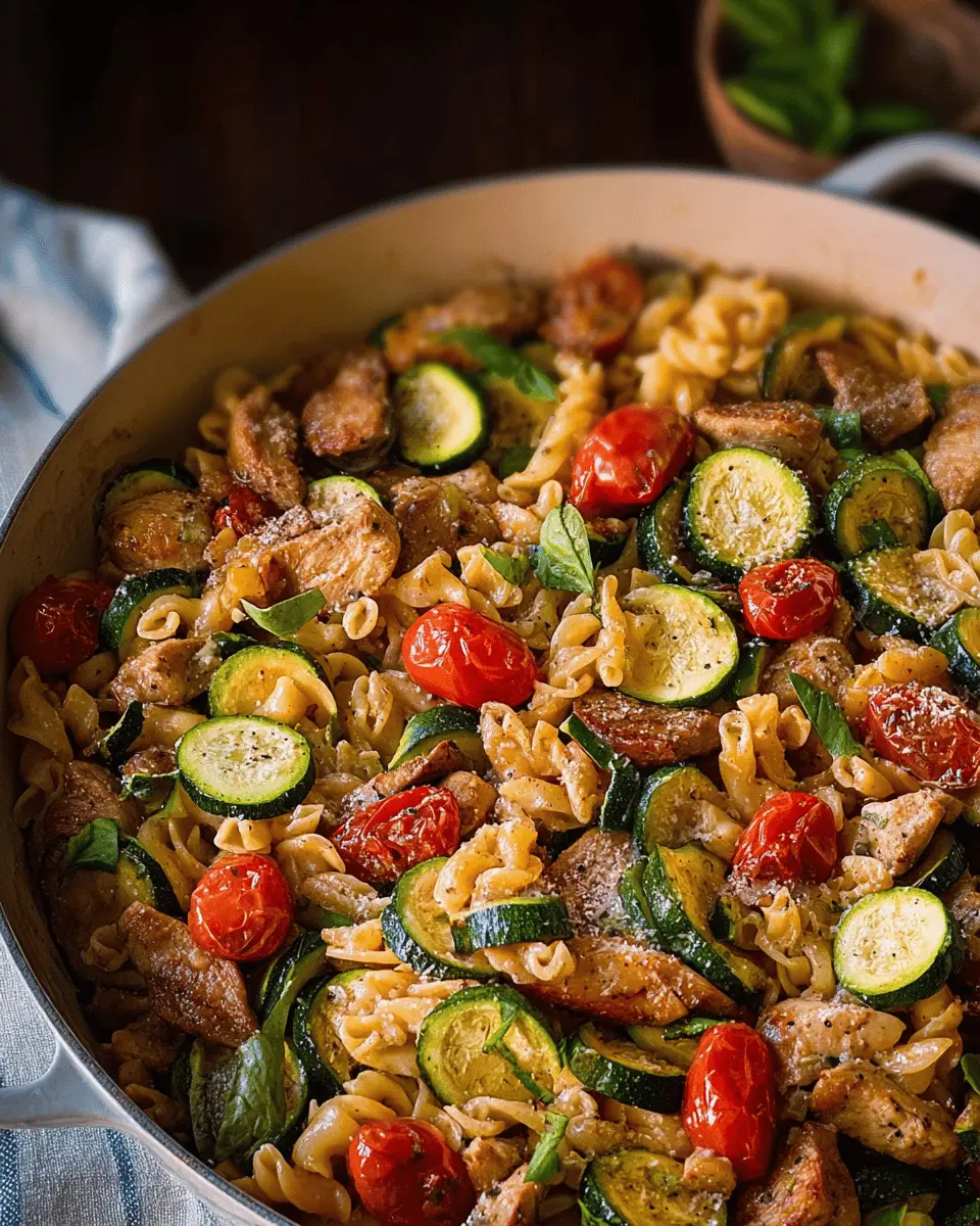 Are you searching for a quick and delicious weeknight dinner that doesn’t skimp on flavor? Look no further than the Chicken Zucchini Pasta Skillet! This dish combines juicy chicken sausages with fresh zucchini, vibrant tomatoes, and hearty pasta—all cooked together in one pan for effortless cleanup.