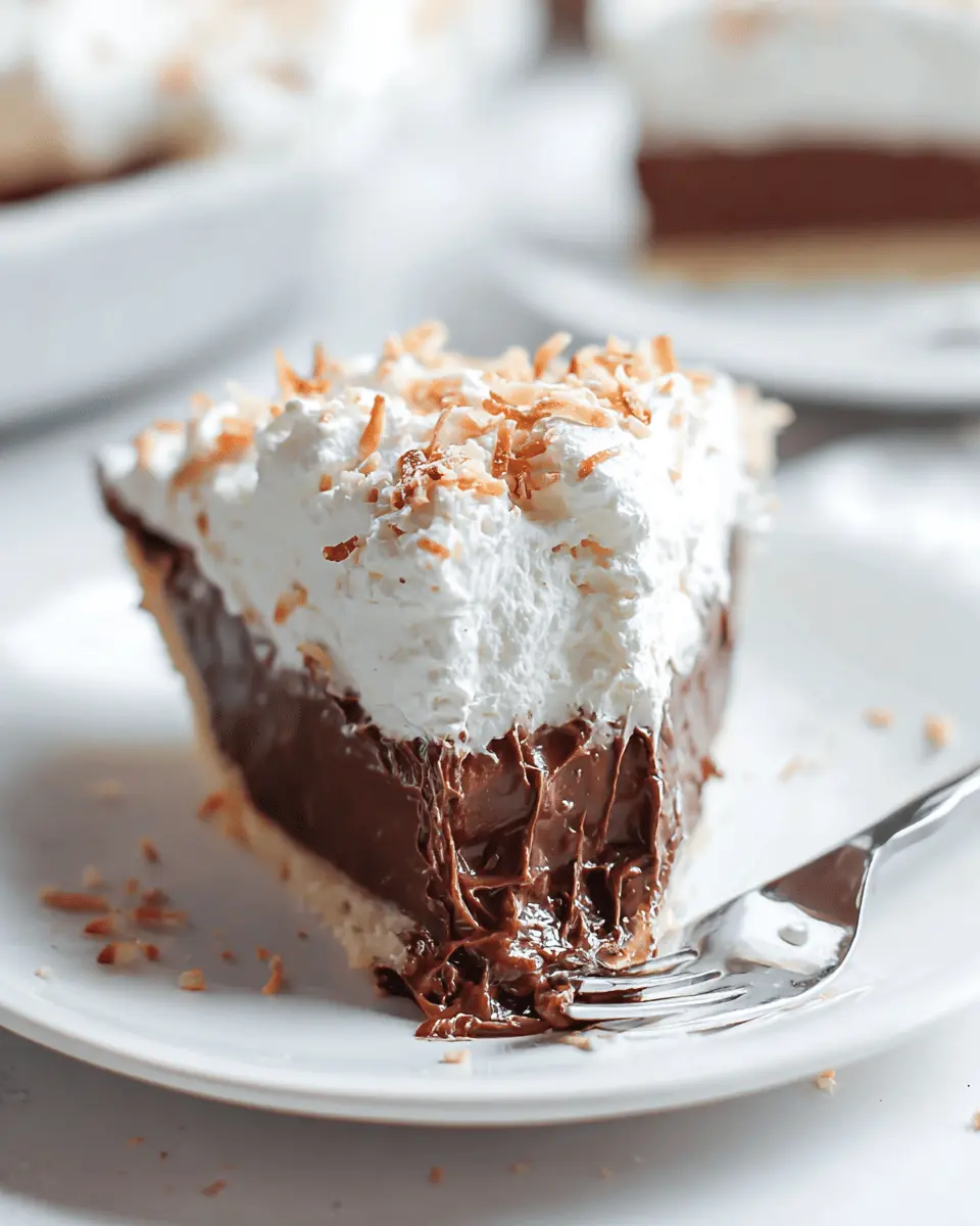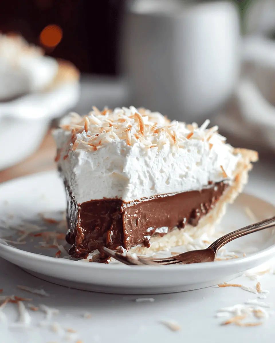 Serving chocolate coconut cream pie is all about presentation! Chill it well before serving for the best flavor and texture. Consider garnishing with toasted coconut and chocolate shavings for an elegant touch. For an extra layer of indulgence, drizzle some chocolate sauce or a dollop of extra whipped cream on top. Remember, sliced pieces paired with a hot cup of coffee make for a delightful treat!