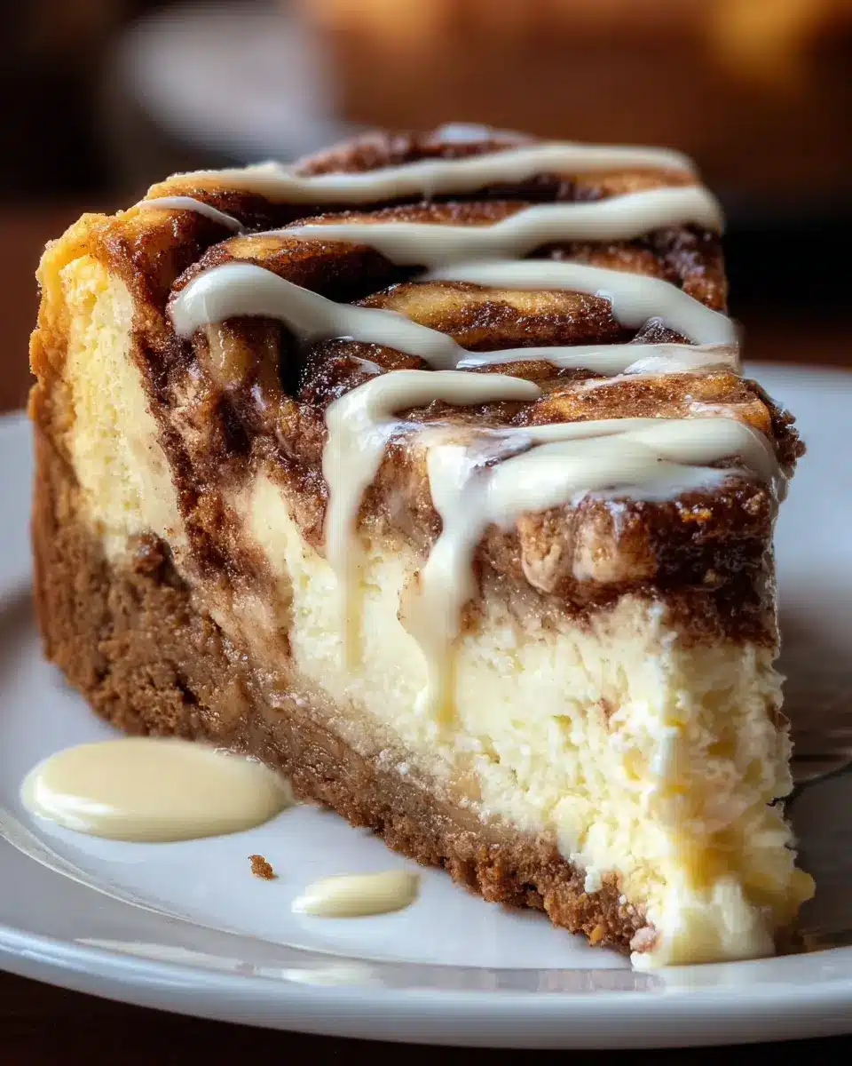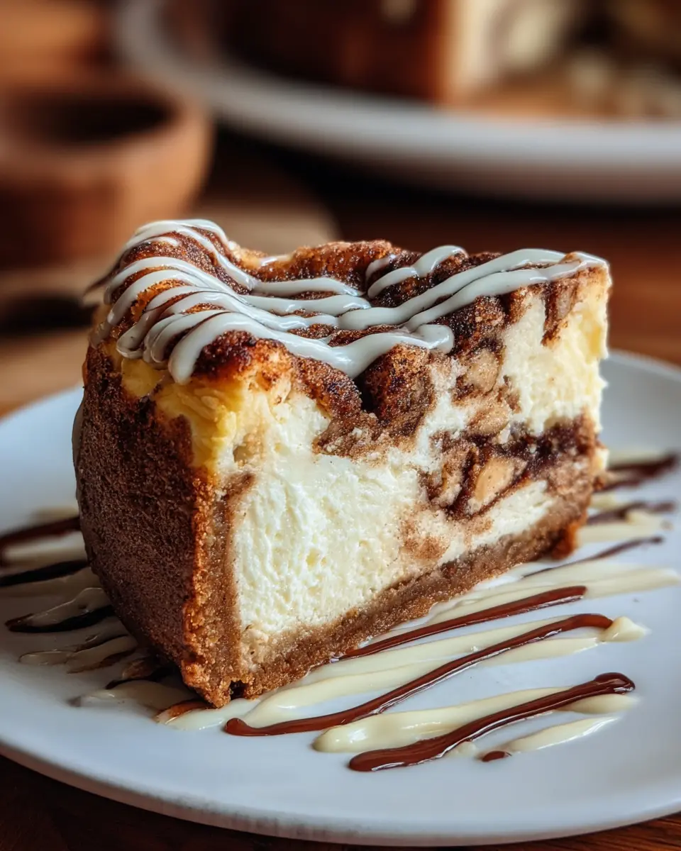 A drizzle of glaze on top adds an extra touch of sweetness to your cinnamon roll cheesecake, enhancing the overall flavor.