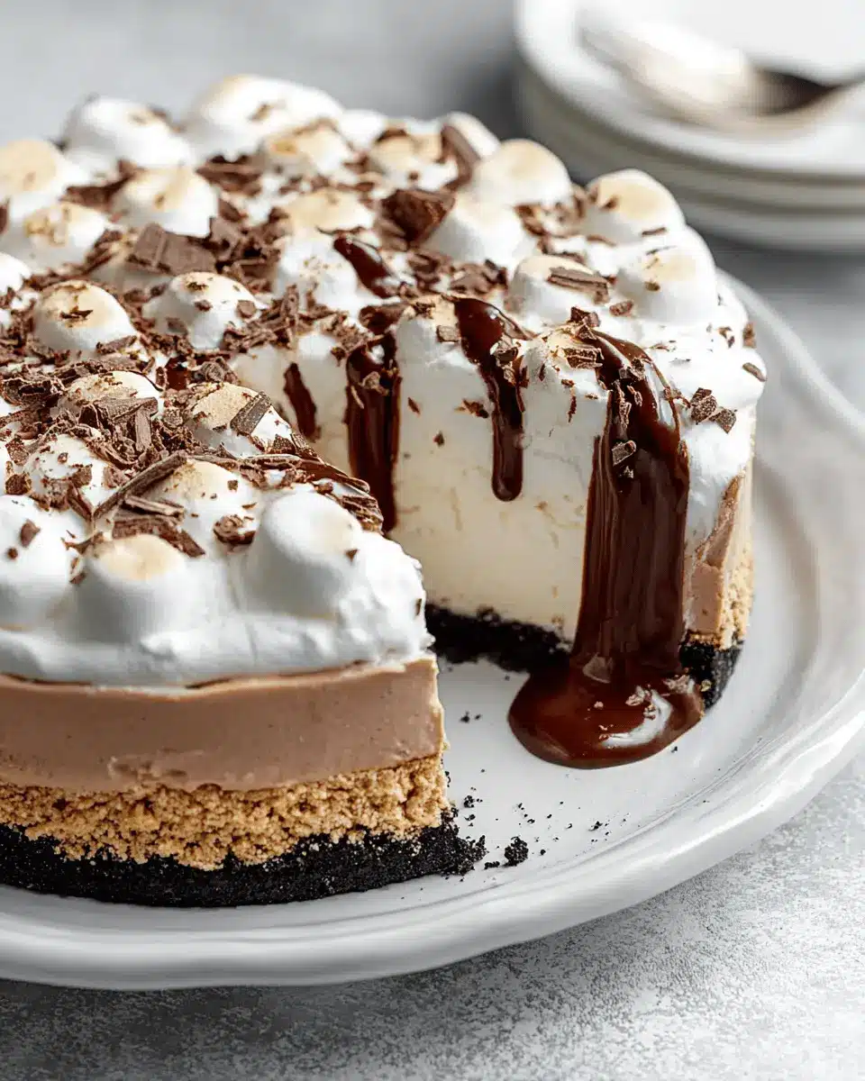 Not to mention, the silky filling made from creamy milk chocolate, fluffy whipped cream, and sweet melted marshmallows creates a dessert experience that’s both decadent and light. Plus, it boasts a mouthwatering chocolate cookie crust that gives every bite a satisfying crunch.