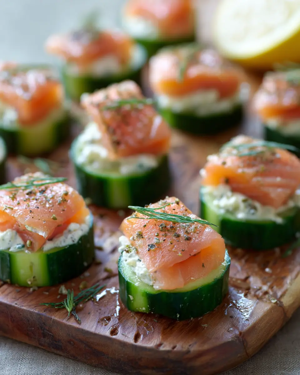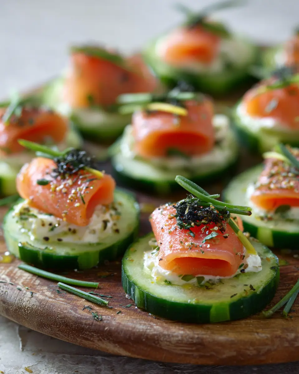 Picture this: You're hosting a last-minute get-together, and your guests arrive eager for bites that won't weigh them down. These refreshing cucumber slices topped with a creamy herb spread and rich smoked salmon are the ideal solution. They cater to various dietary preferences, and you can feel good knowing they're packed with flavor without compromising on nutritional value—smoked salmon is rich in omega-3 fatty acids, and the cucumbers add a crisp, hydrating crunch.