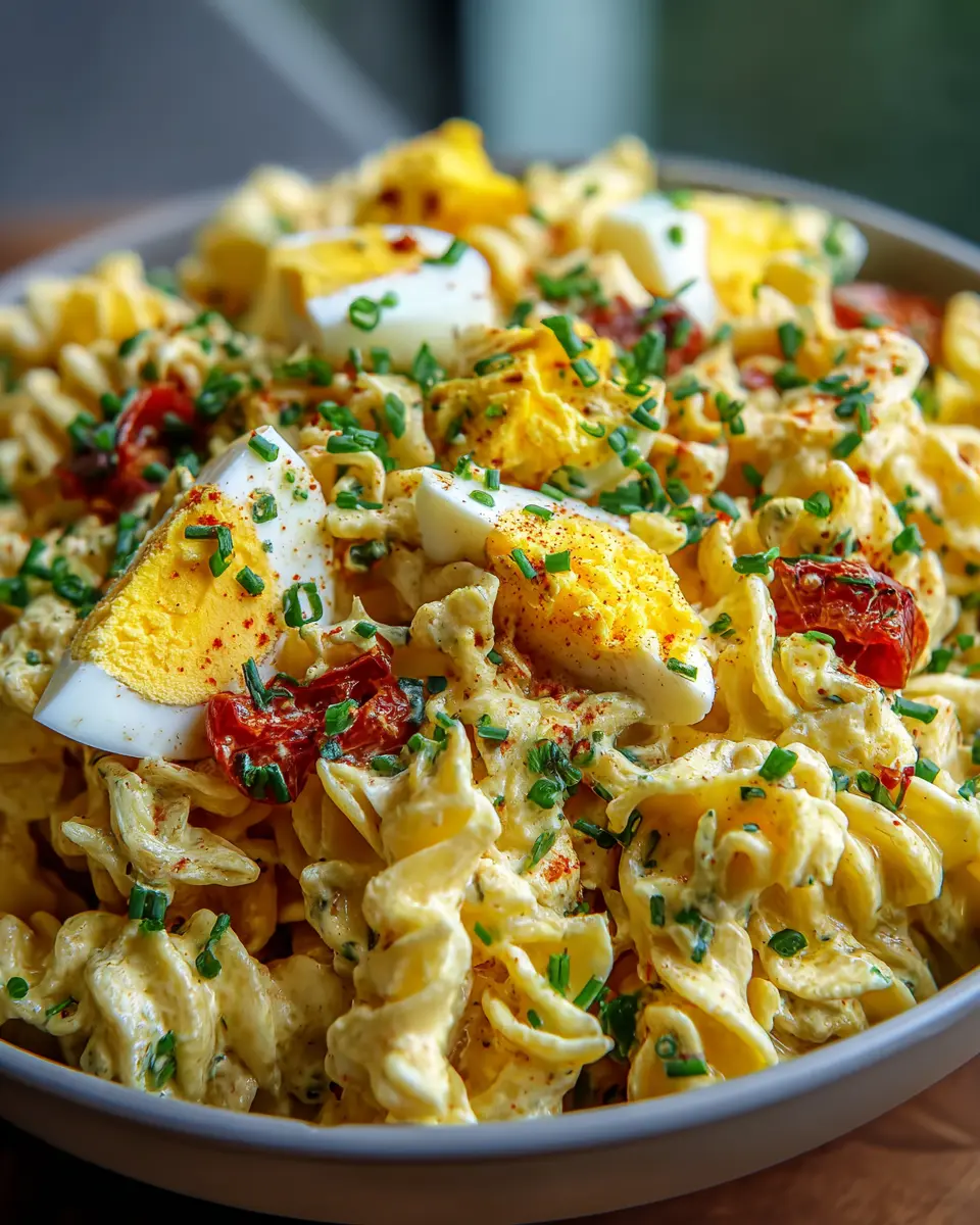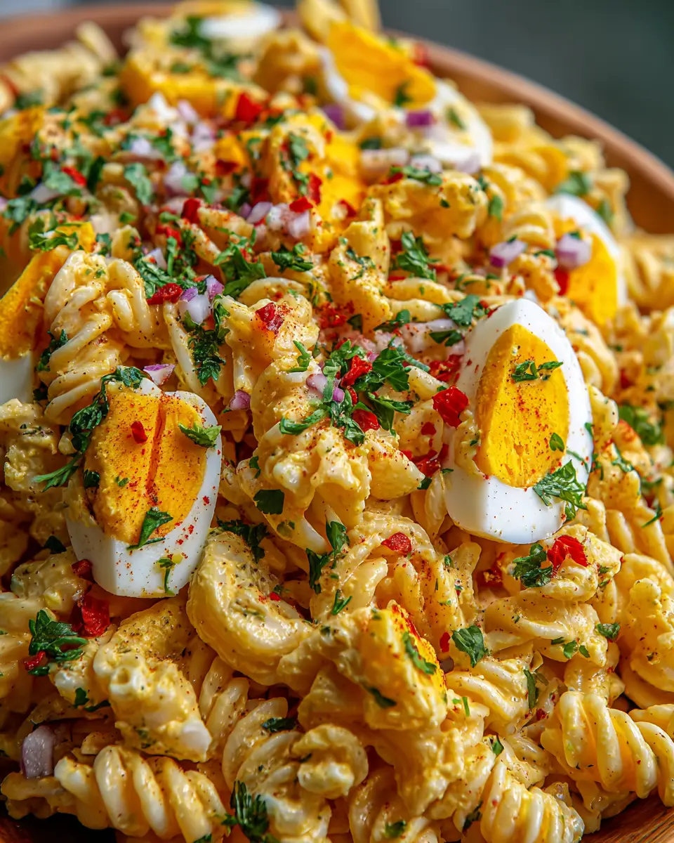 Now that your egg pasta salad is put together, it’s time to let the flavors mingle. Cover your bowl and refrigerate the salad for at least 30 minutes—or even a few hours if possible. Chilling helps to bring out the flavors, transforming your dish into a harmonious blend of ingredients. Just before serving, arrange the reserved egg whites on top as a garnish and sprinkle with extra paprika or fresh herbs for a pop of color.