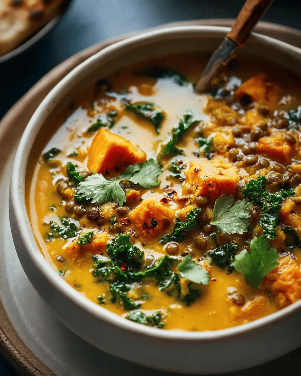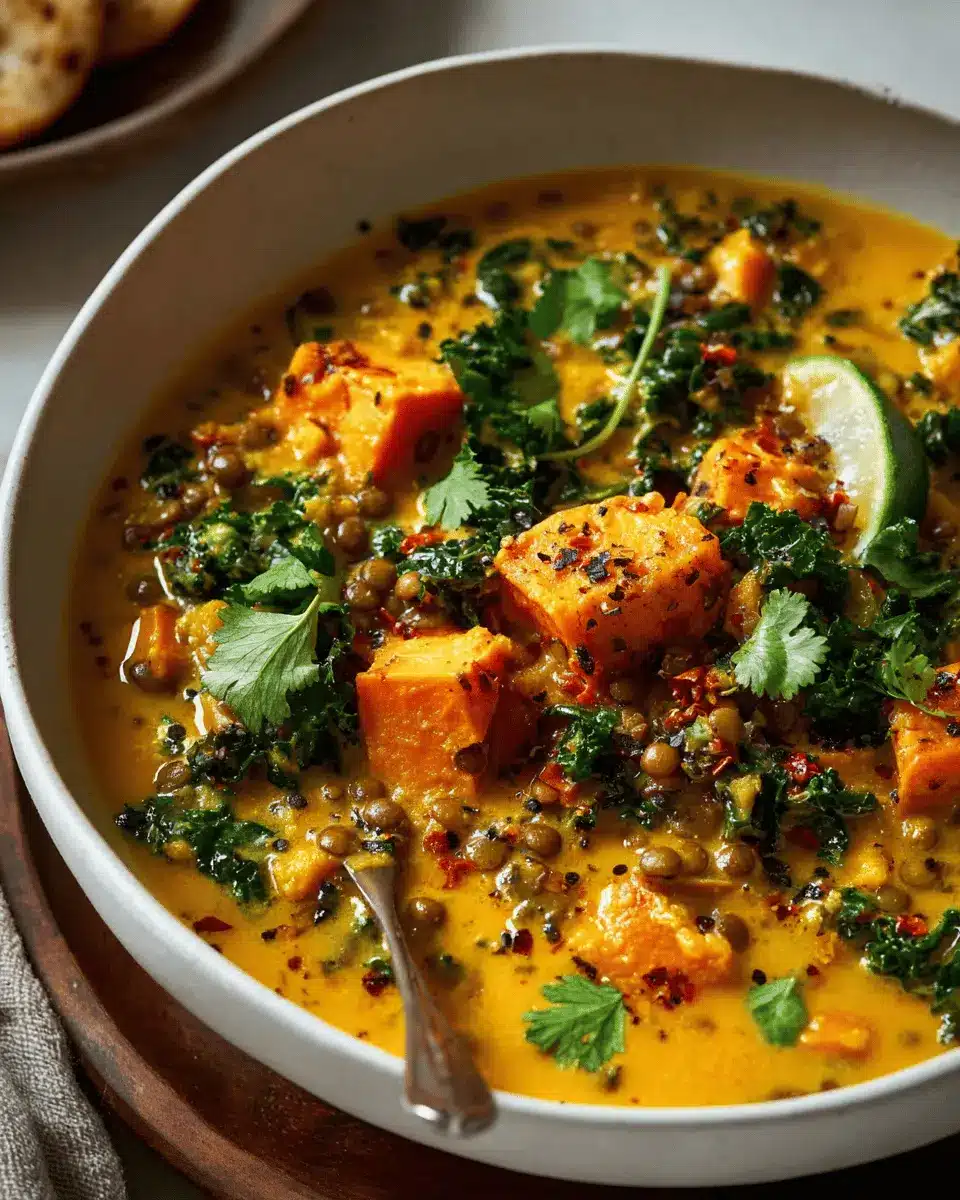 Ginger Sweet Potato Coconut Milk Stew with Lentils & Kale