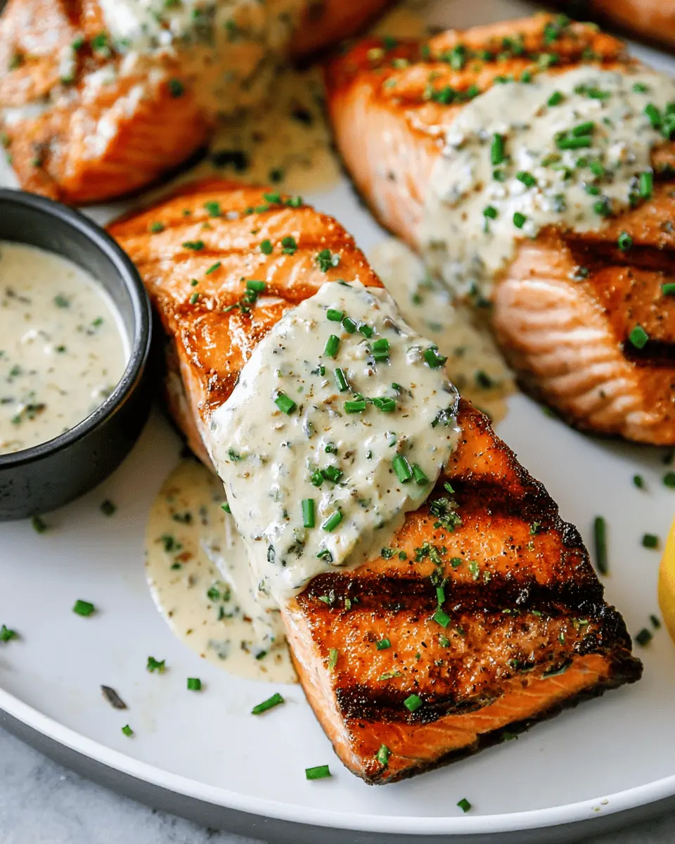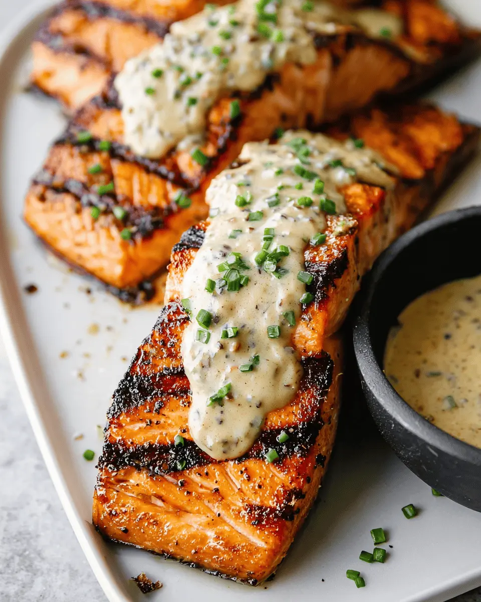 Once your grilled salmon steaks are cooked to perfection, it’s time to serve. Plate the steaks and drizzle a generous amount of your creamy mustard chive sauce on top. For an extra touch, garnish with additional chives or a lemon wedge on the side. This dish pairs wonderfully with grilled vegetables or a fresh garden salad.