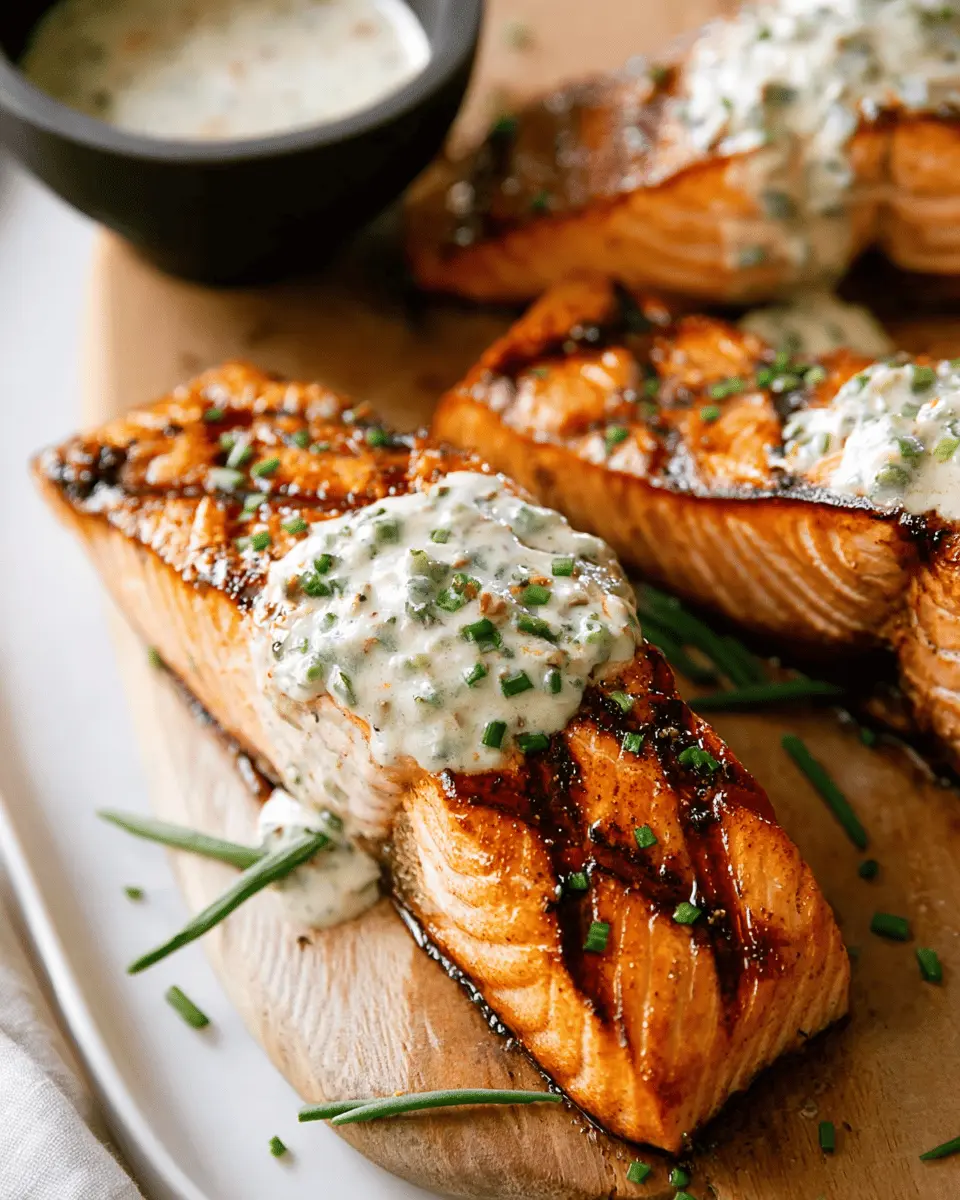Grilled Salmon Steaks with Creamy Mustard Chive Sauce