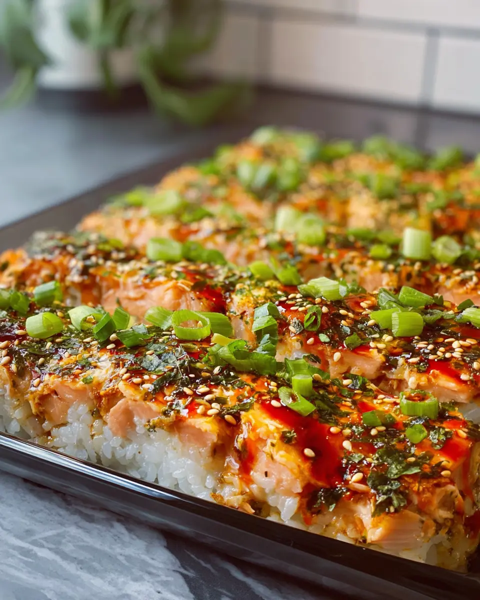 This step is where the magic of how to make salmon sushi bake really happens! Preheat your oven to 450°F. In a 9x13 casserole dish, start by layering 4 cups of cooked short-grain sushi rice at the bottom. Sprinkle a generous amount of furikake—a flavorful Japanese rice seasoning—over the rice. Next, evenly spread your salmon mixture on top. Drizzle with extra sriracha, a touch of Japanese mayo, and eel sauce to elevate the flavors. Finish with another sprinkle of furikake for that crunchy texture on top.