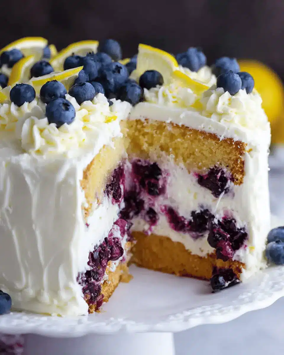 - Continue frosting with a thin spatula or offset spatula until the top and sides of the cake are evenly frosted. Garnish with blueberries and lemon slices, if desired.