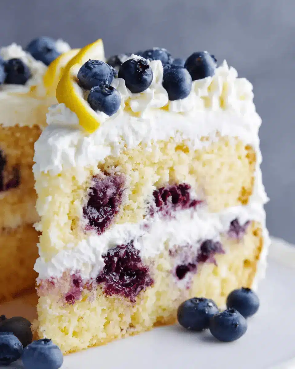 Once your cakes are completely cool, stack them on a serving plate. Begin by spreading frosting on top of the first layer before gently placing the second layer upside down on top. Finish frosting the top and sides, and don’t forget to add garnishes like fresh blueberries and lemon slices for that extra wow factor!