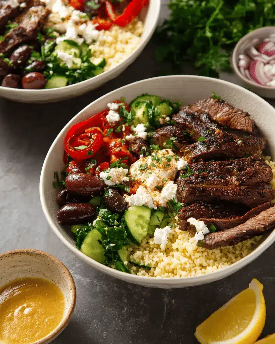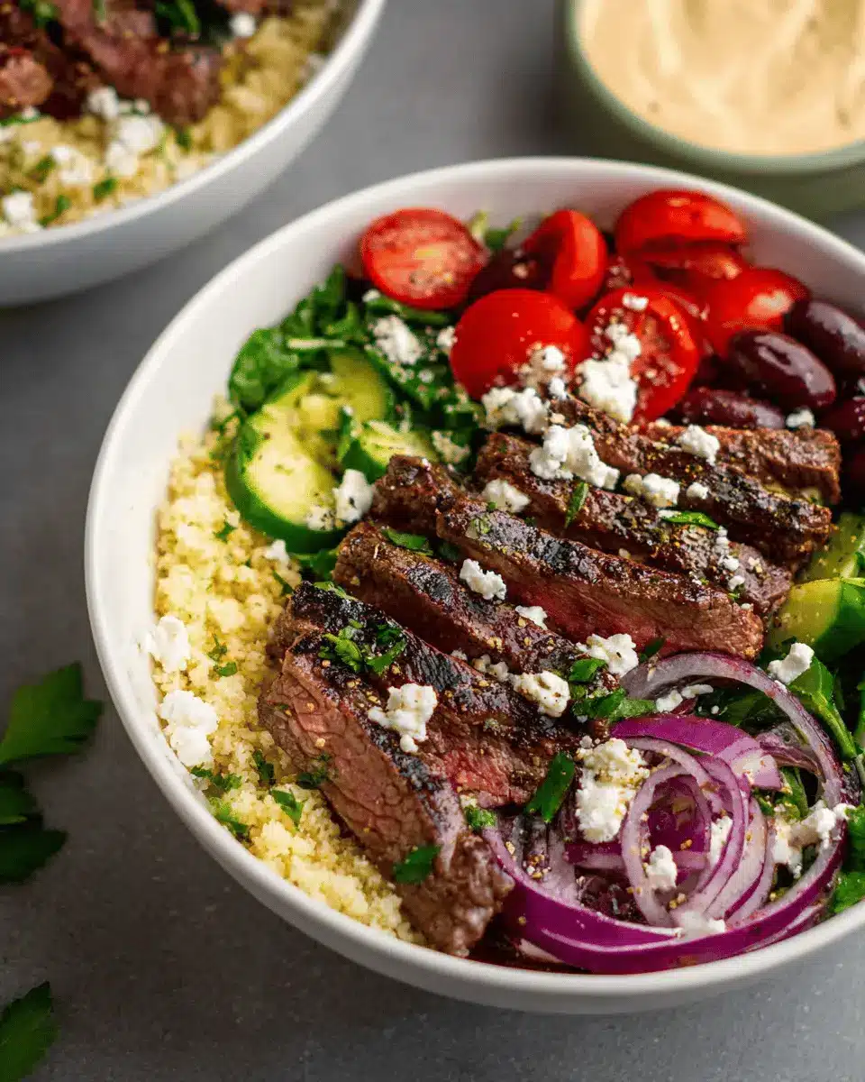 Mediterranean steak bowls are a deliciously vibrant and nutritious choice for any weeknight meal. Packed with protein and fresh ingredients, they offer a wholesome and satisfying dinner option that everyone will love. Give this recipe a try, and enjoy the Mediterranean flavors bringing warmth to your table.