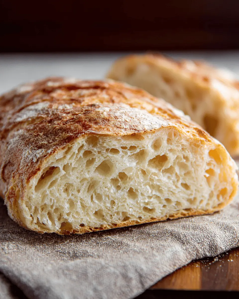 Now comes the moment of truth! Bake your loaves for 25 to 30 minutes until they are golden brown and sound hollow when tapped. Transfer them to a cooling rack, and let your no knead ciabatta bread cool completely before slicing into that beautiful crumb.