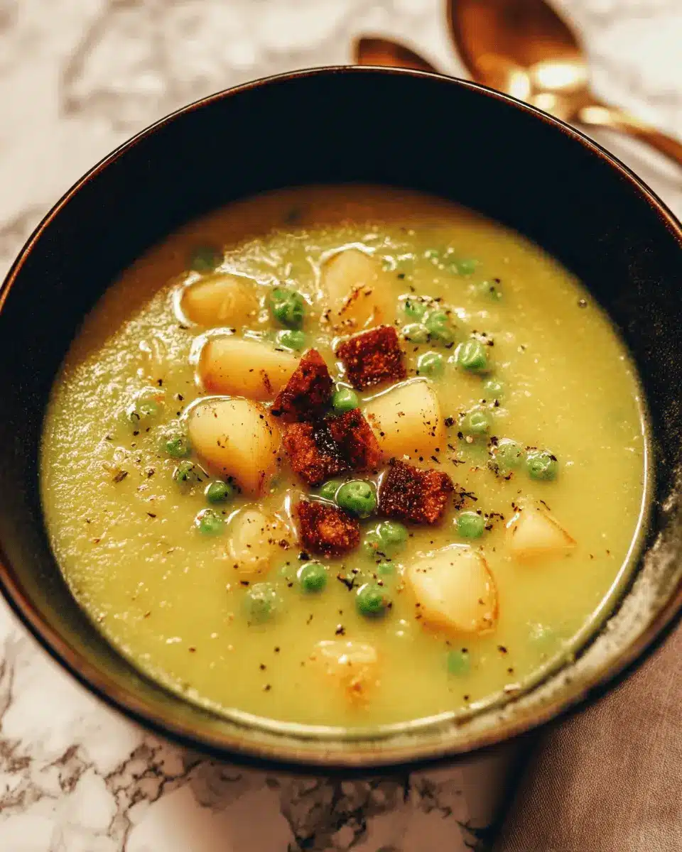 For a vegetarian or vegan-friendly version of your soup, simply use vegetable stock and skip the butter in the croutons, opting for a plant-based oil instead. Adding a splash of coconut milk, as mentioned in the recipe, will enrich the texture without sacrificing creaminess. Want some protein? Toss in some cooked lentils or chickpeas! These simple swaps can make your pea and potato soup a comforting option for everyone at the table.