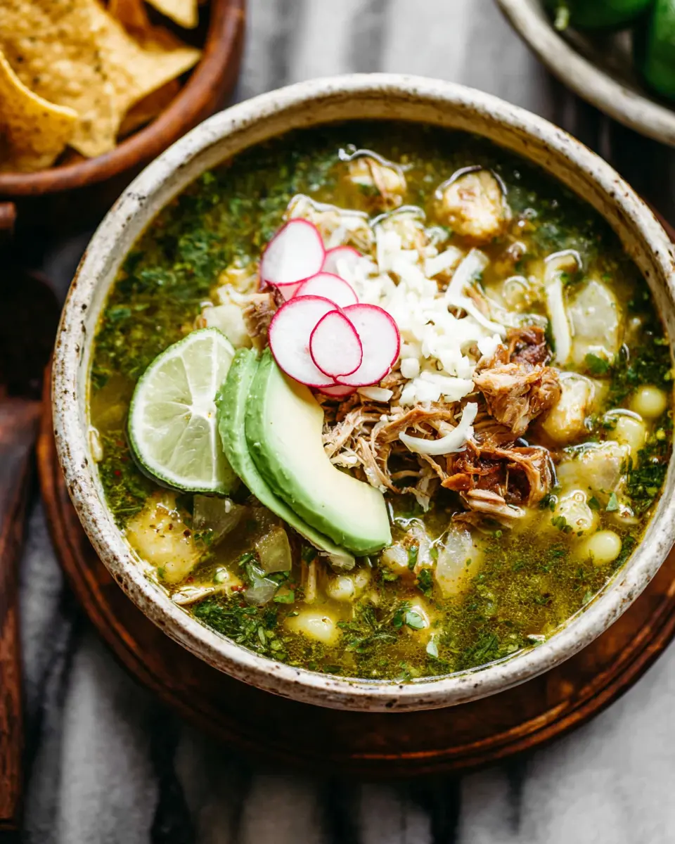 Pozole Verde is a vibrant and flavorful Mexican stew that warms the soul. It primarily features hominy, a special corn that adds both texture and heartiness to the dish, and is traditionally made with tender shredded chicken. The defining element of this particular recipe is the rich green broth, which is crafted from tomatillos, poblano peppers, and cilantro, creating a refreshing twist that distinguishes it from other varieties of pozole.