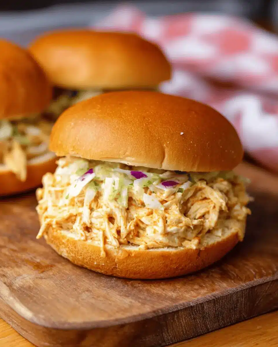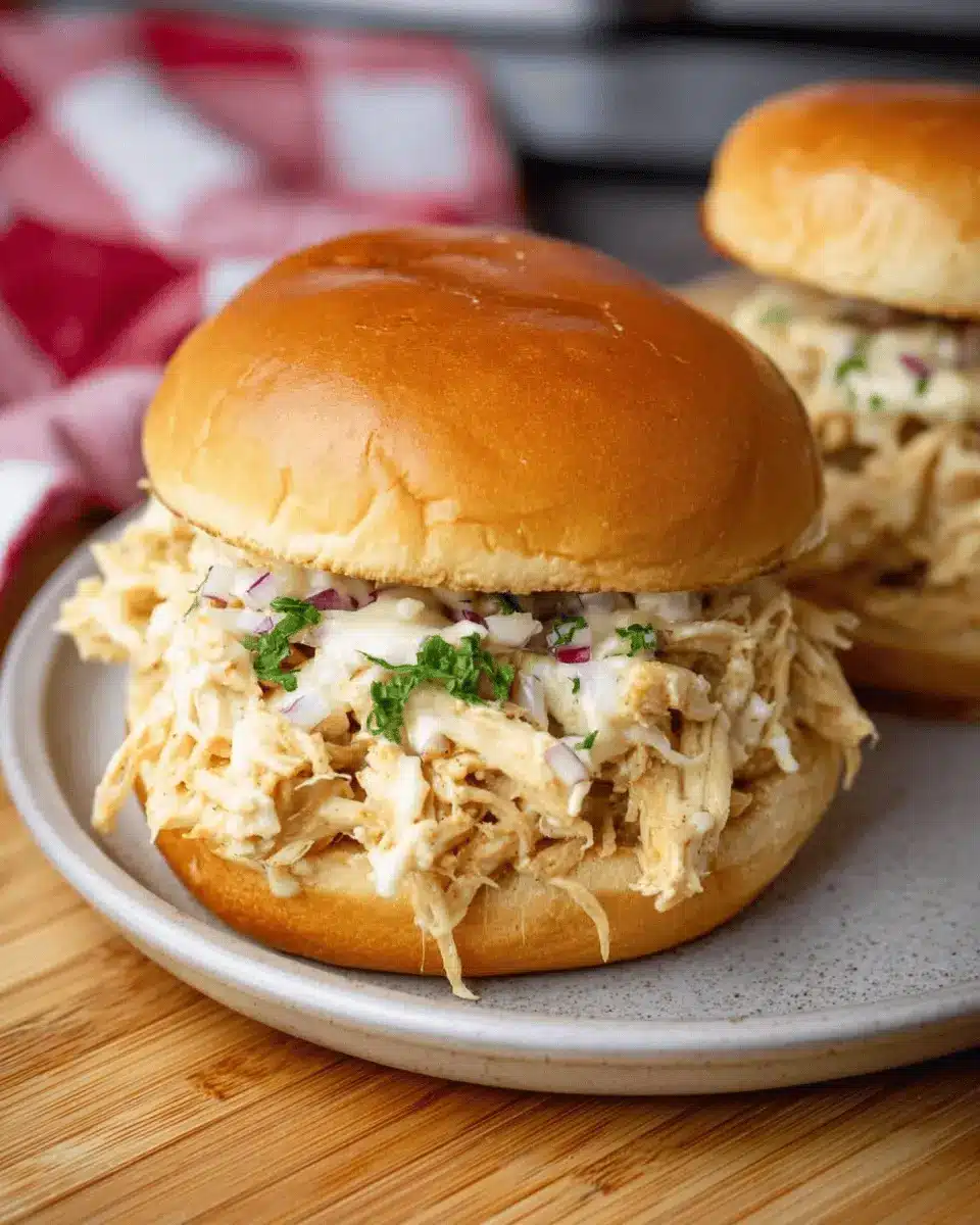 To achieve tender, juicy shredded chicken sandwiches, use a slow cooker as specified in the recipe. Cooking on LOW for about 3-4 hours ensures the chicken retains moisture and flavor. An instant-read thermometer can help confirm the chicken reaches an internal temperature of 165°F for safety. If you prefer a quicker method, poaching chicken in broth on the stovetop can yield similar results.