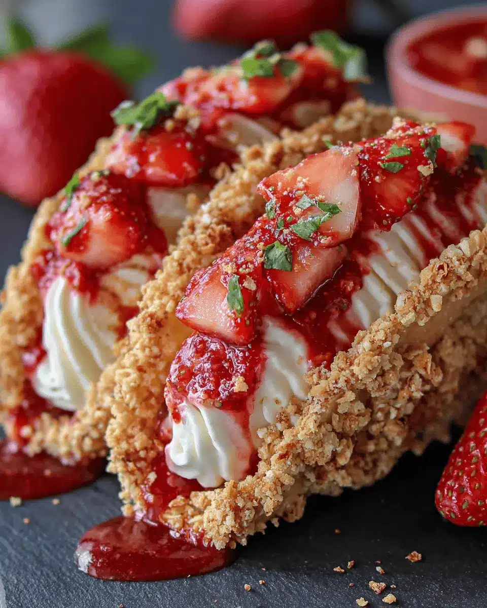 For plating, arrange the tacos in a vibrant, reusable taco holder on a rustic wooden board. Drizzle with additional strawberry syrup and sprinkle some crushed strawberries or nuts on top for added texture. This eye-catching presentation will wow your guests and make dessert the star of the evening!
