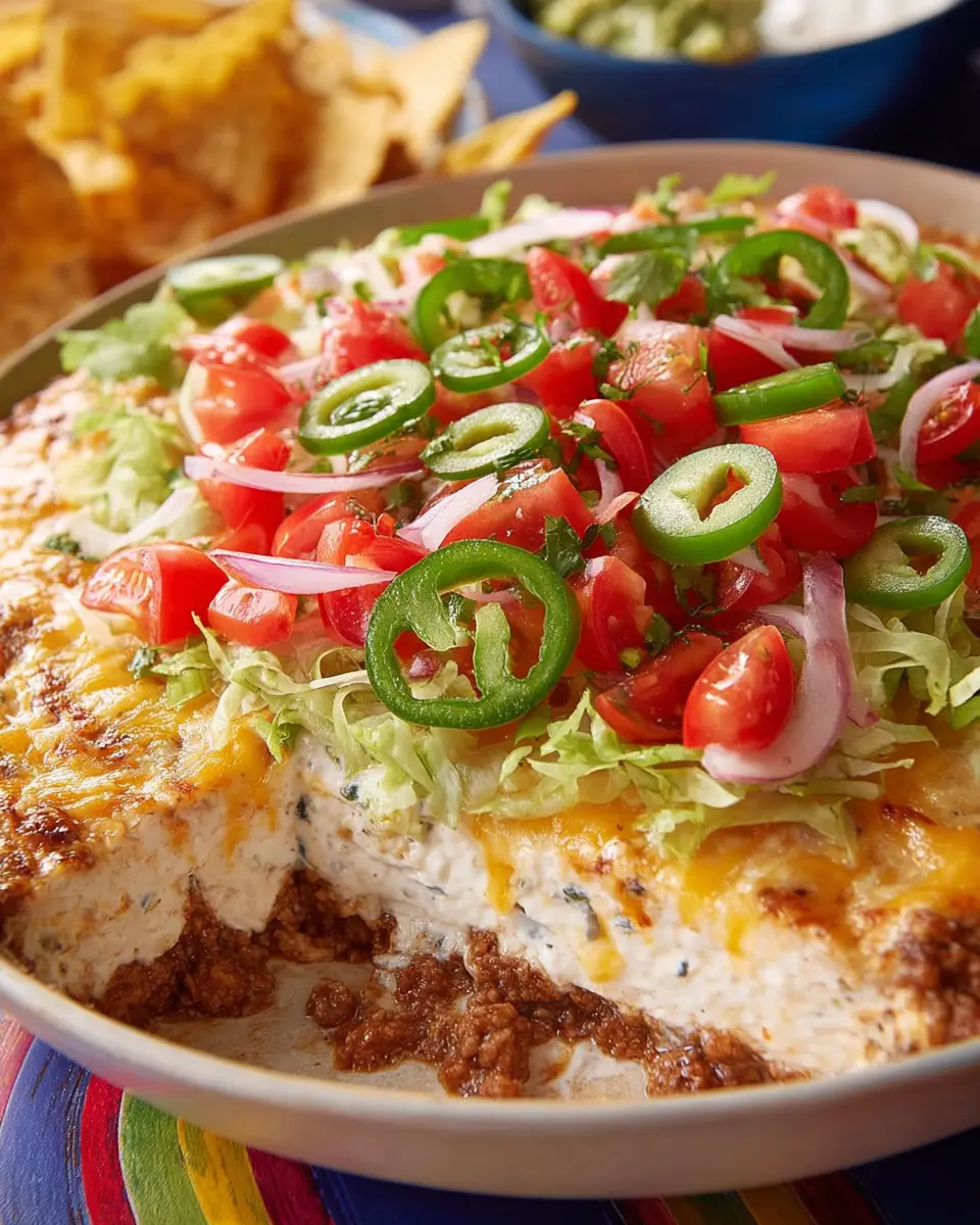 At this point, you’re nearly there! Finish off your taco dip by adding any finishing touches. A sprinkle of extra jalapeños is a classic choice, or consider fresh cilantro for a touch of brightness. Serve with hot sauce on the side for those who like their dip with a kick. Finally, don’t forget to set out some crunchy tortilla chips for dipping!