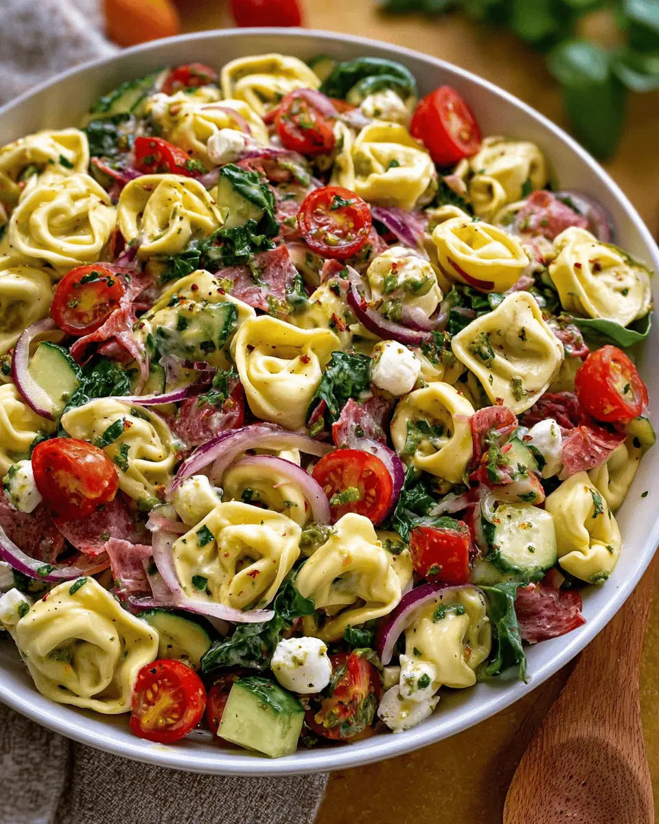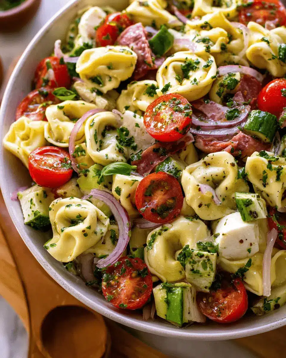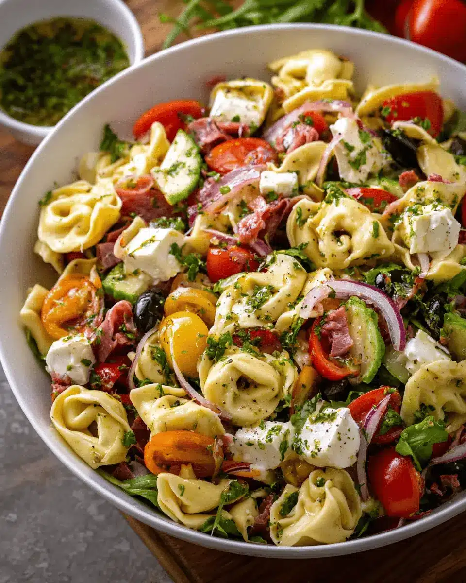 Here’s where you can get creative! Toss in a delightful mix of ingredients to elevate your tortellini salad. Begin with quartered marinated artichoke hearts, halved mozzarella cheese balls, and sliced salami. Then add sweet baby tomatoes, colorful bell peppers, crunchy cucumbers, diced red onion, and olives. Don’t forget to sprinkle in some fresh herbs like parsley and basil to brighten up the dish! This combination brings a vibrant burst of flavor and texture that complements the tortellini beautifully.